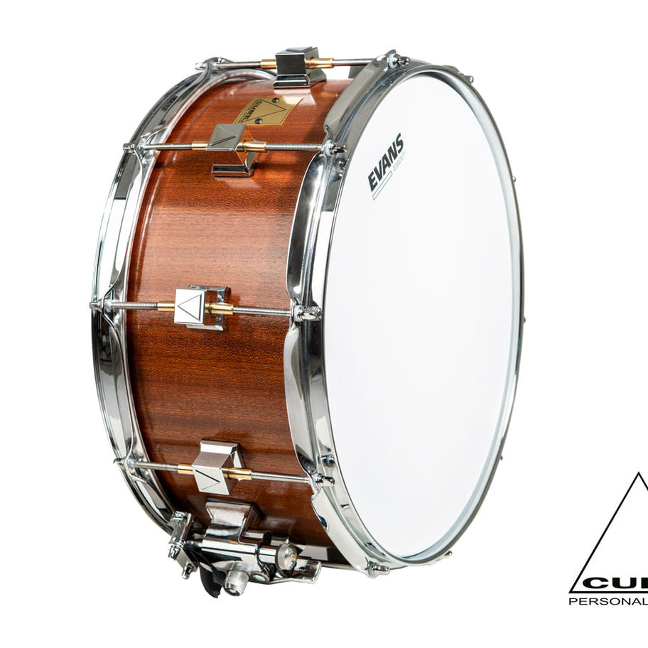 Cube 14“x6,5“, 4,5mm Mahogany/Poplar Kessel, Bearing Edges 45° roundover, Hardware Chrom, Cube Lugs, 3mm Power Hoops, Nickel Drumworks Strainer, Brass Badge, Semi Gloss Finish, Bronzeteppich 20 Spiralen, Evans Heads